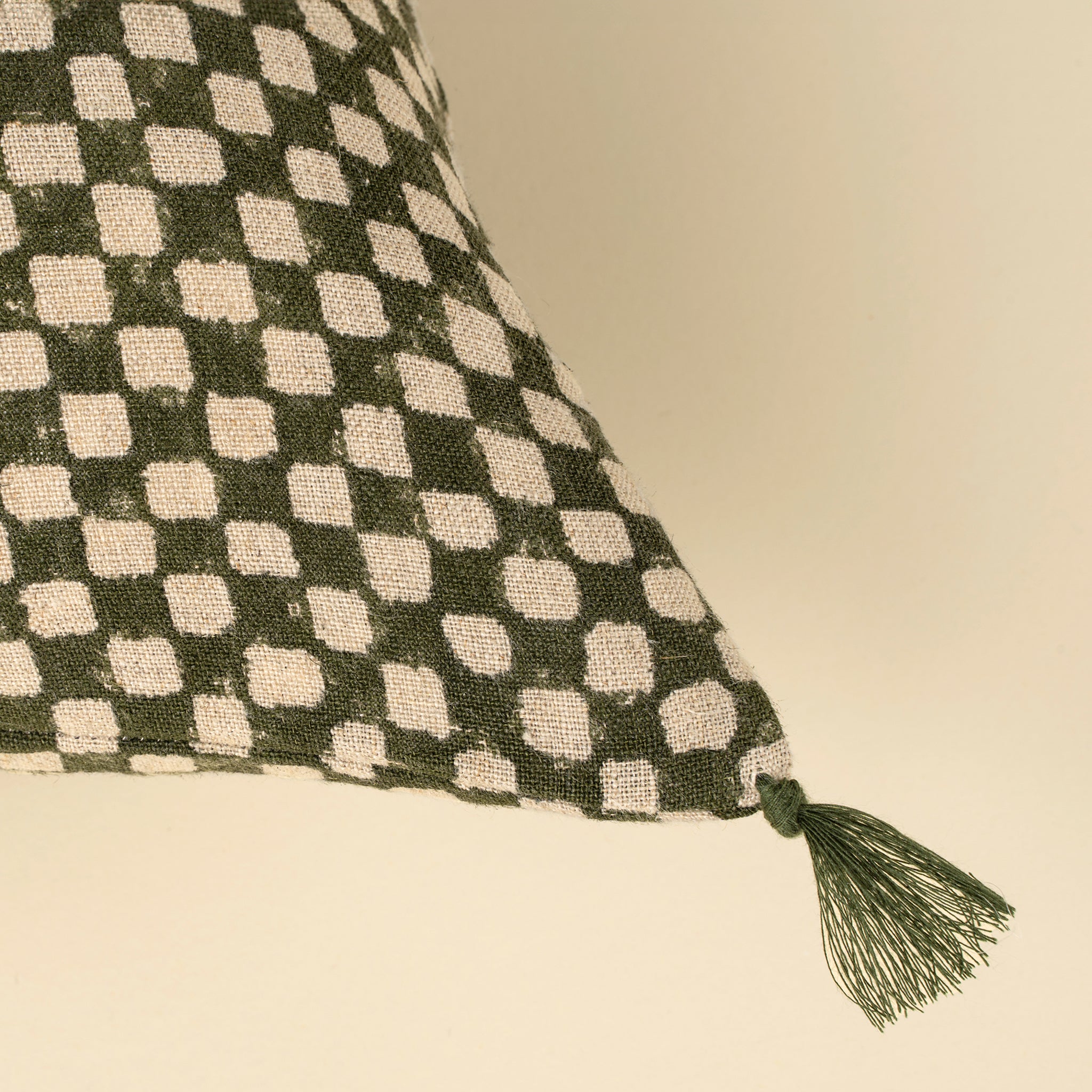Add the bold Check Linen Pillow to your home. Made in India from 100% Belgian linen, this decorative toss pillow features a hand block printed checkerboard design in dark green. Delicate tassels on each corner lend an extra layer of artisan charm. A celebration of traditional crafting methods, it offers a fresh take on accessory pillows with lasting appeal. RDS certified premium feather down filler included.